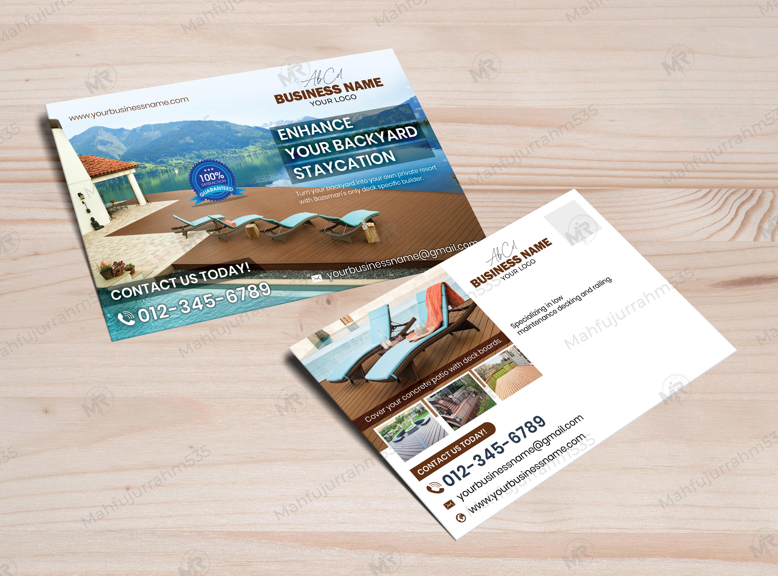 Transform any outdoor space into a luxury retreat with our professional Backyard Decking Postcard Design. This high-conversion marketing tool is specifically crafted for deck builders, hardscaping contractors, and outdoor renovation specialists. The design focuses on the concept of a "Backyard Staycation," using high-quality imagery of serene deck layouts, poolside lounging, and modern railing solutions to captivate homeowners looking to upgrade their living areas.