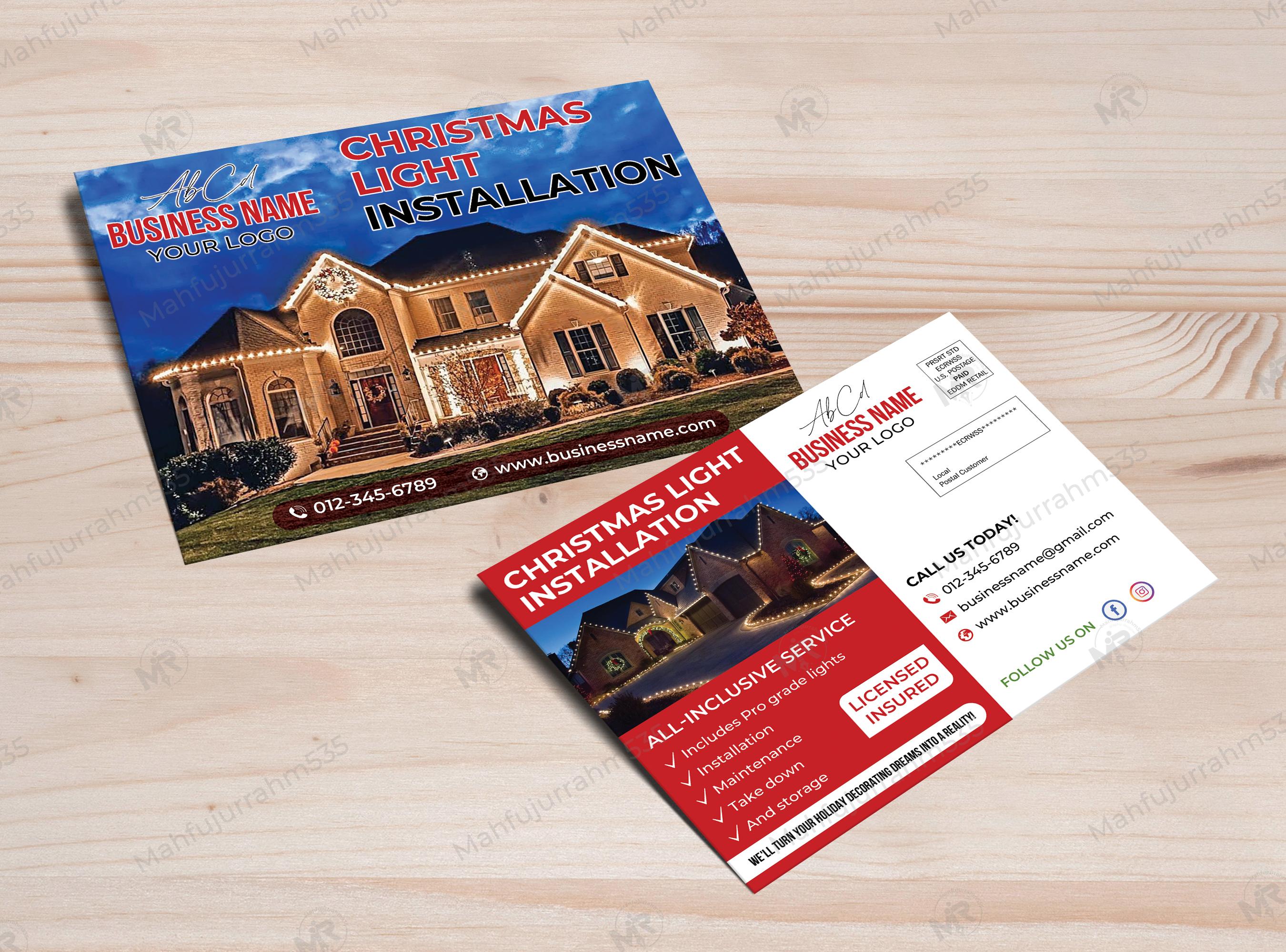 This postcard is a ready-to-customize template for Christmas Light Installation businesses. The layout and text are carefully designed based on verified service information, making it a perfect fit for companies in this niche. Minimal changes will be required, saving you time while ensuring your brand looks polished and professional. If you’re looking to promote your seasonal services effectively, this postcard design delivers both beauty and practicality.