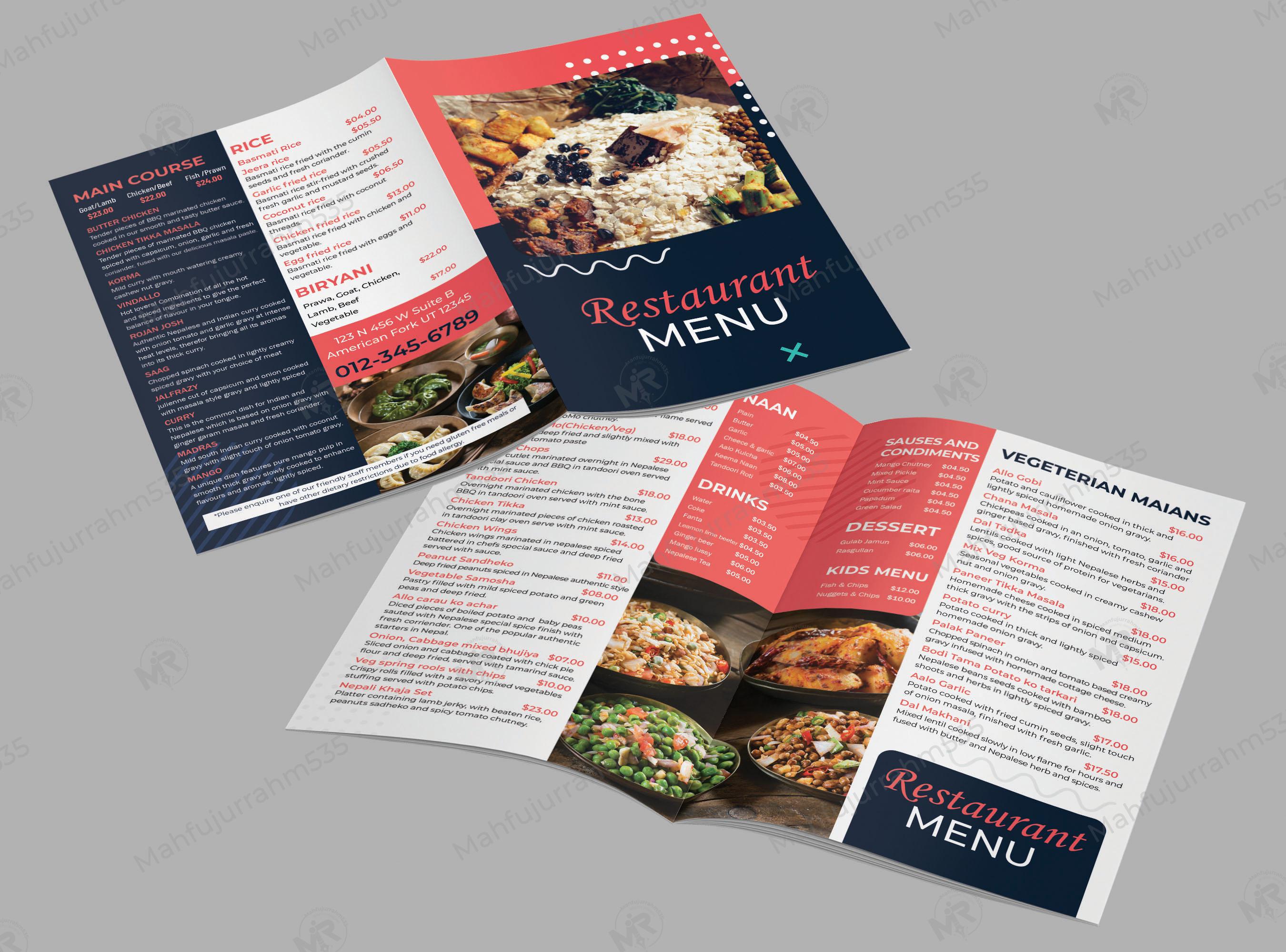 Optimize customer ordering and showcase your culinary variety with this professional Bi-Fold Restaurant Menu Design. This detailed brochure template is essential for Indian and South Asian Restaurants that feature a large, diverse menu requiring clear organization. The design is strategically structured using verified restaurant industry information, ensuring that all major categories—Main Course, Vegetarian Mains, Rice, Biryani, and Sides—are clearly displayed and easy to read. This makes it the perfect, ready-to-use asset for any restaurant specializing in this cuisine, requiring minimal customization to implement immediately.