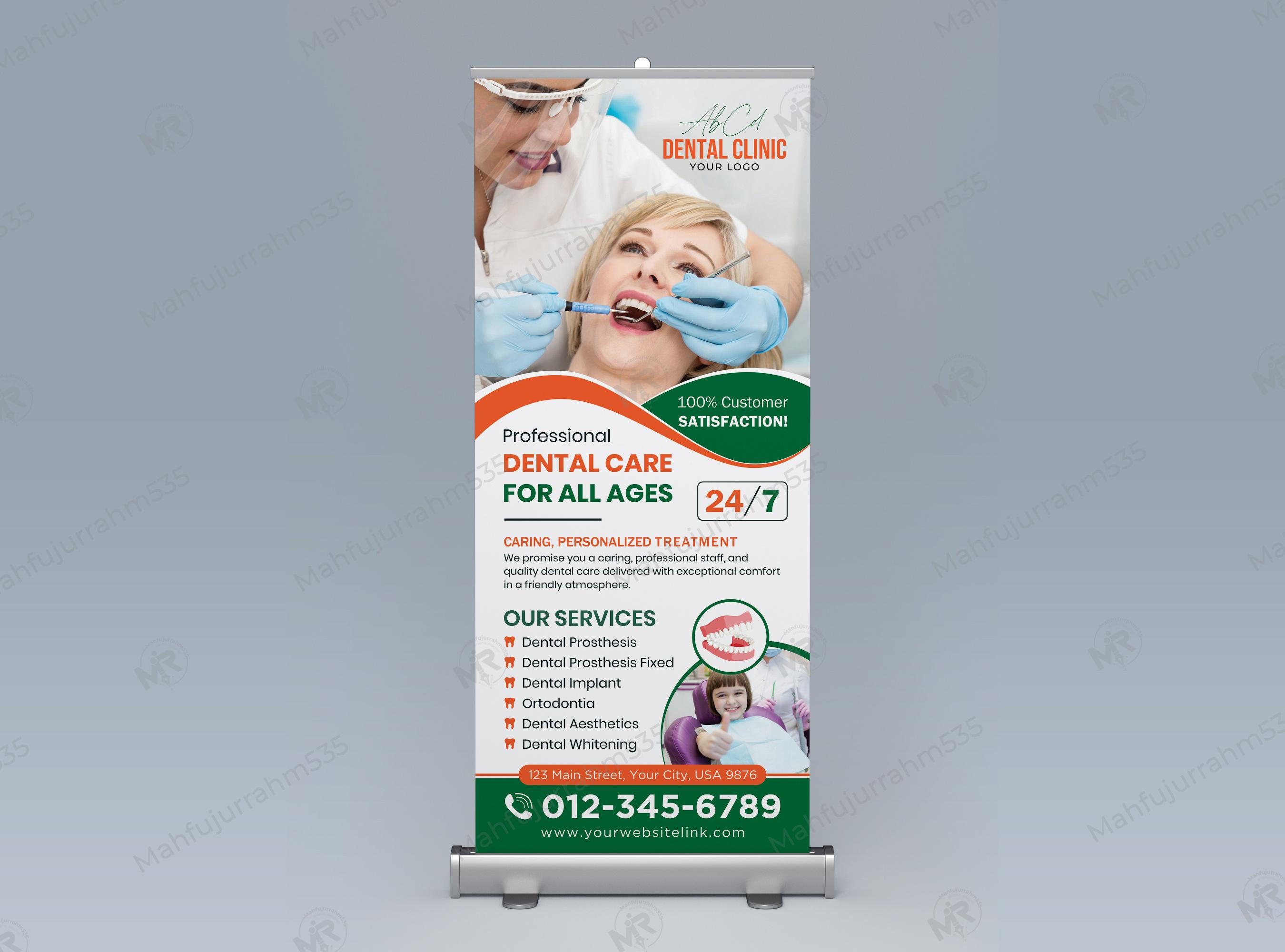 This roll-up design was specially created for dental services. This design was created in such a way that any dental service can use it. The dental services's correct information was used in this design. If you like this design, we hope you don't have to change much in this design. And if you want to change something then we will make the changes according to your needs. If you want to take this design, please start a project by clicking on "PROJECT START" from the right side of the design above. We will first edit the design according to your company information, and then send you the final file.