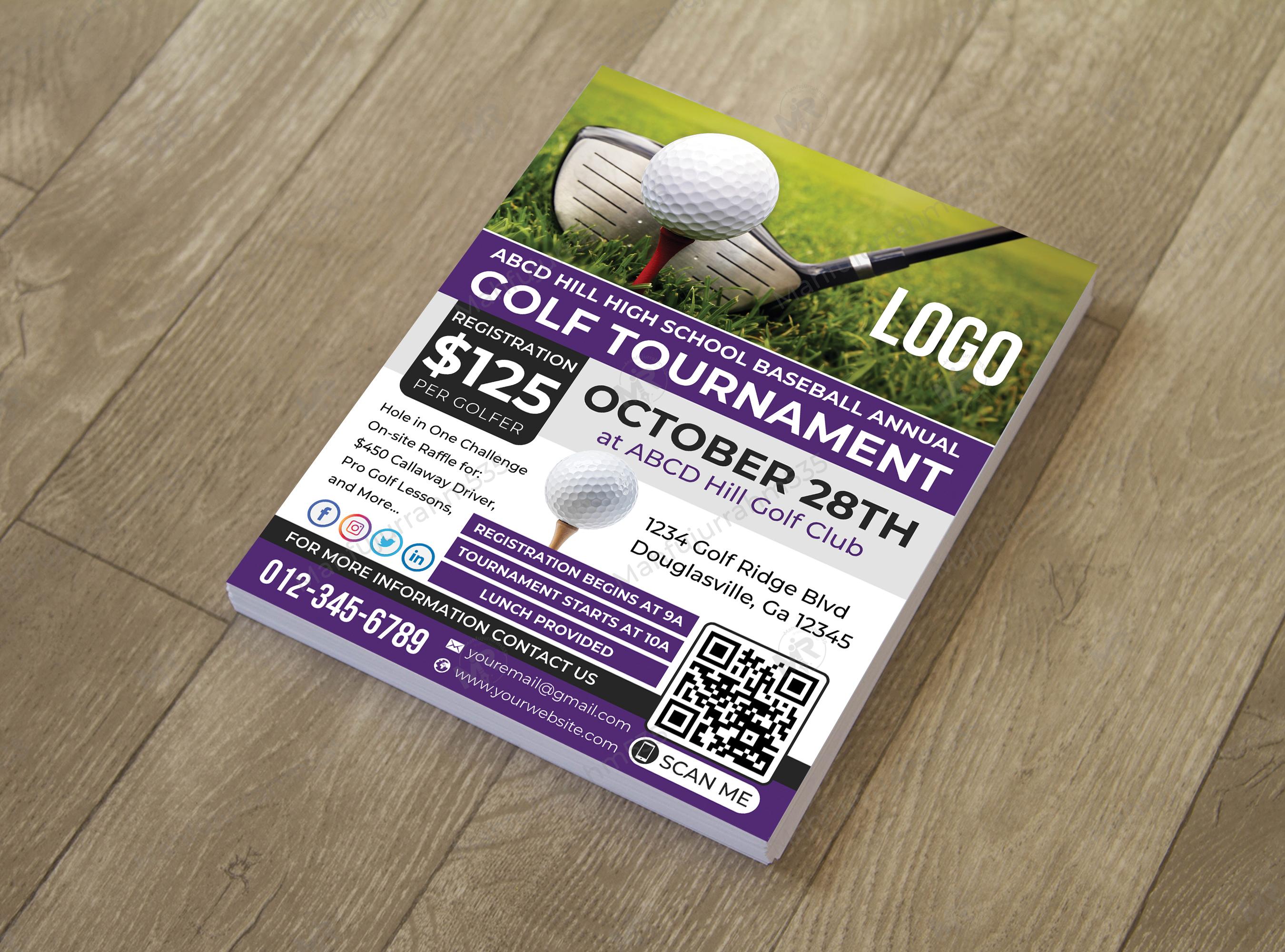 This premium Golf Tournament Flyer Design is crafted for golf clubs, school tournaments, charity fundraisers, corporate outings, and community events seeking a professional, high-impact promotional piece. The layout features bold event banners, clear registration pricing blocks, date/time/place callouts, a prominent QR code area, and well-organized event highlights — all optimized to drive registrations and spectator interest. High-quality imagery of golf equipment and course greens creates instant recognition. At the same time, the structured information panels make it easy for participants to find fees, contact details, and event schedules at a glance.