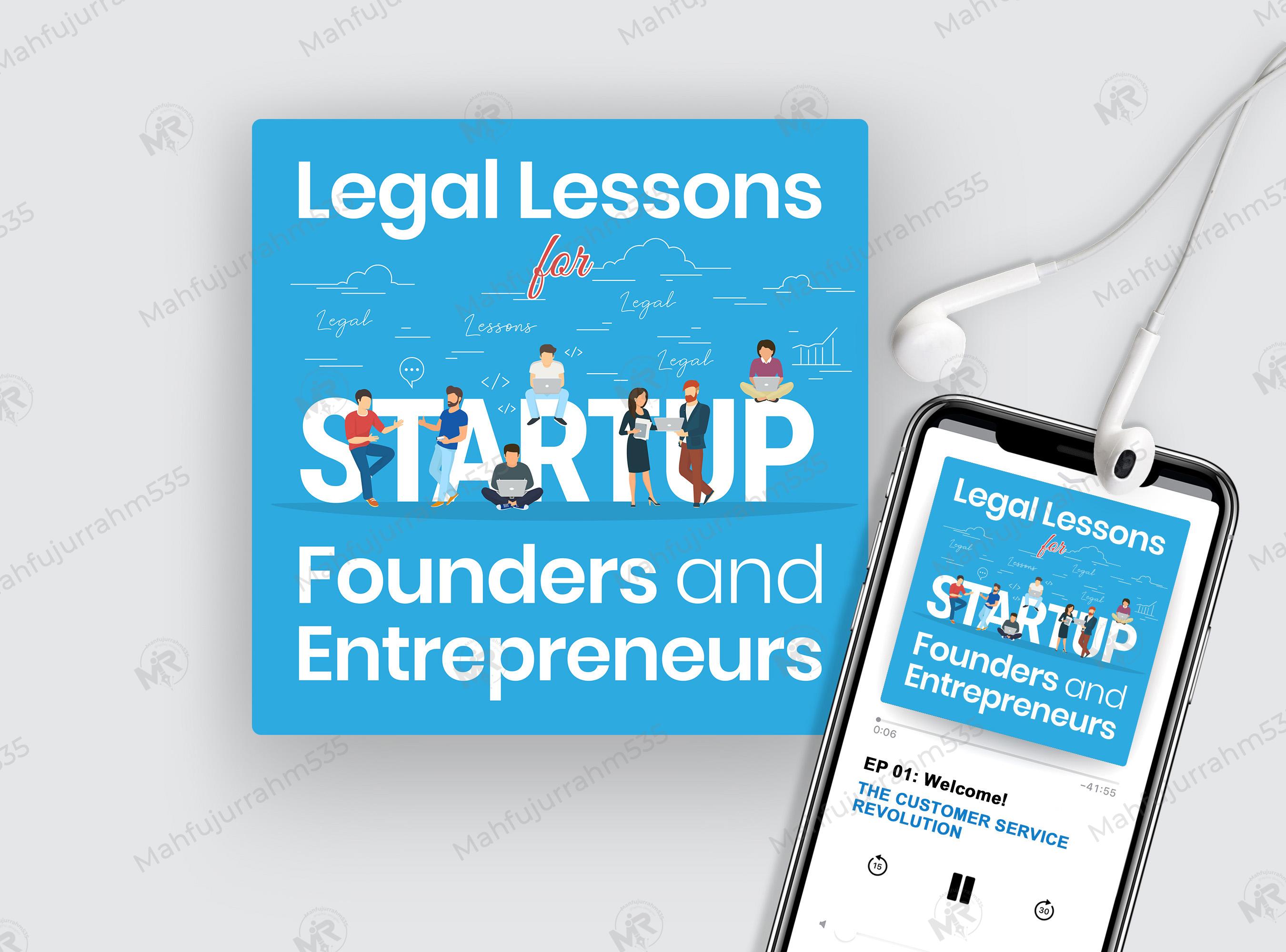 Elevate your digital presence with our premium Law - Legal Services Podcast Cover Design, specifically tailored for the "Legal Lessons for Startup" series. This high-quality cover art is designed to capture the attention of ambitious founders and entrepreneurs looking for expert legal guidance. The design features a vibrant blue background with professional illustrations of diverse team members collaborating around the word "STARTUP," symbolizing growth, teamwork, and business infrastructure.