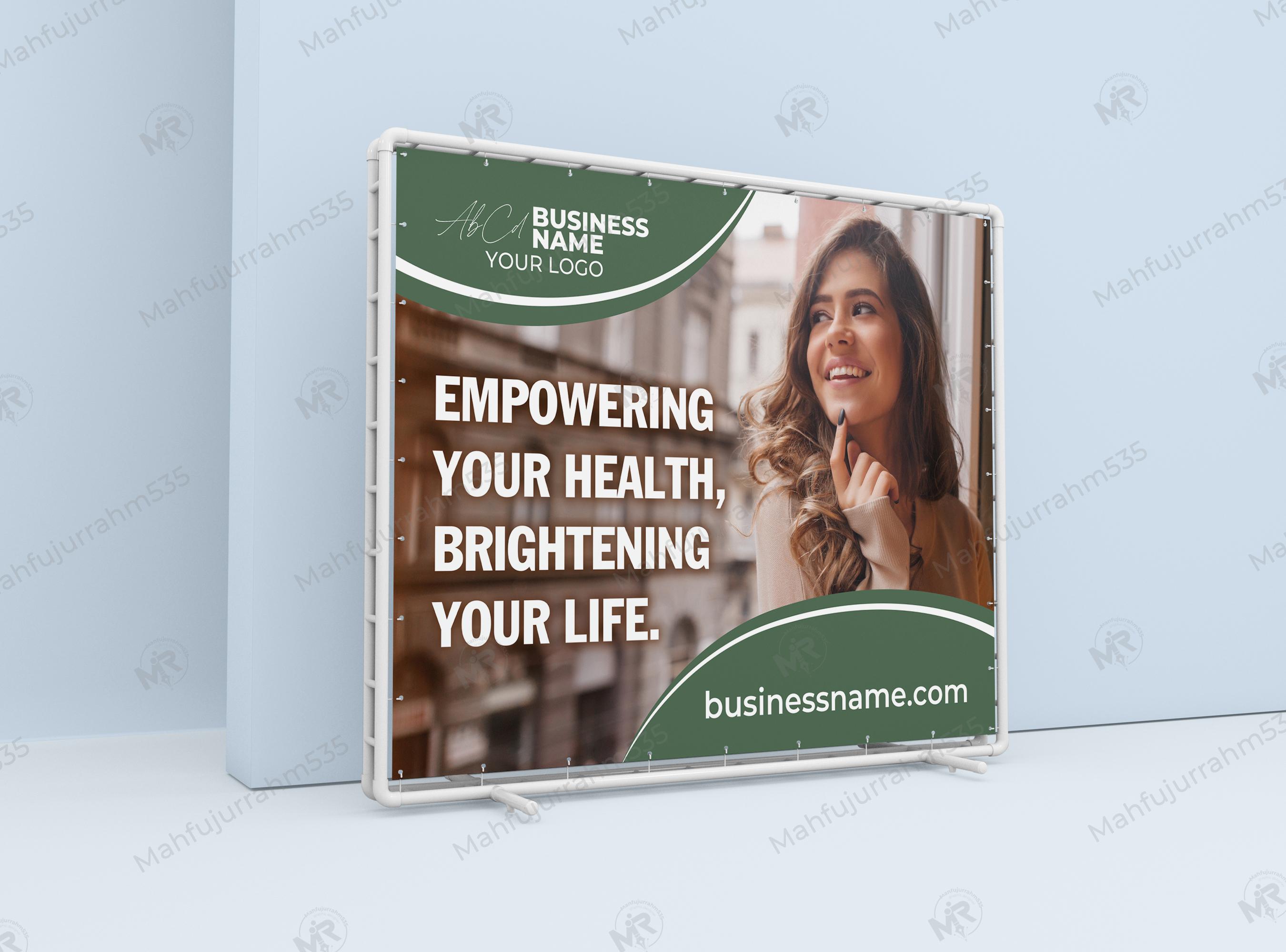 Make a lasting impression at your next medical convention or community health fair with this expertly crafted Medical-Healthcare Trade Show Banner. This design features a sophisticated forest green and white color palette, paired with an uplifting high-resolution image that resonates with patients and professionals alike. The bold, centered typography—“Empowering Your Health, Brightening Your Life”—is strategically placed to capture attention from across the exhibition hall, ensuring your brand message is seen and felt.