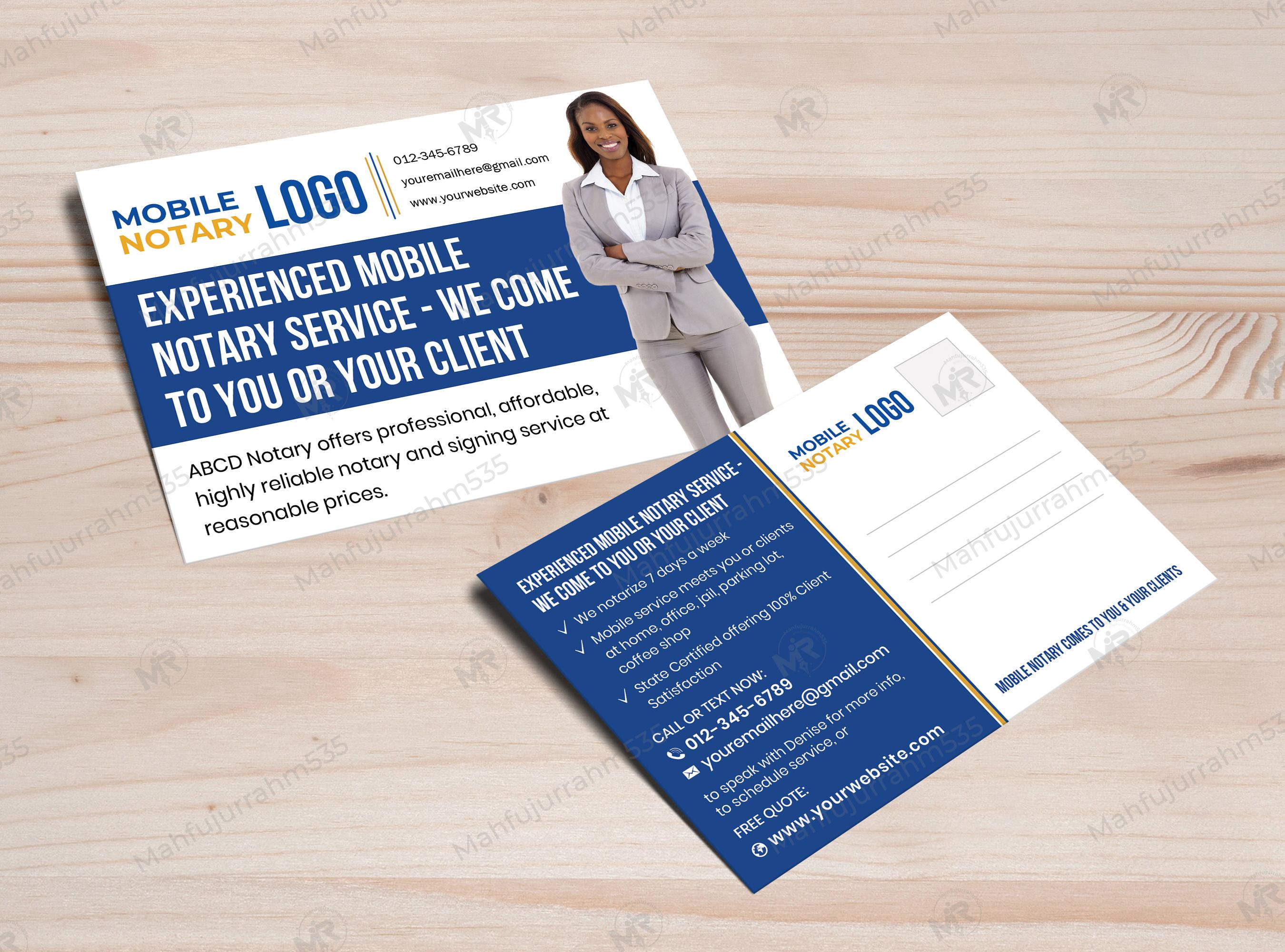 Stand out in the competitive legal services market with this high-impact Mobile Notary Services Postcard Design. This template is specifically engineered for professional notaries who prioritize convenience by traveling directly to their clients. The design features a sophisticated navy blue and white color palette, projecting an image of authority, trust, and professionalism.
