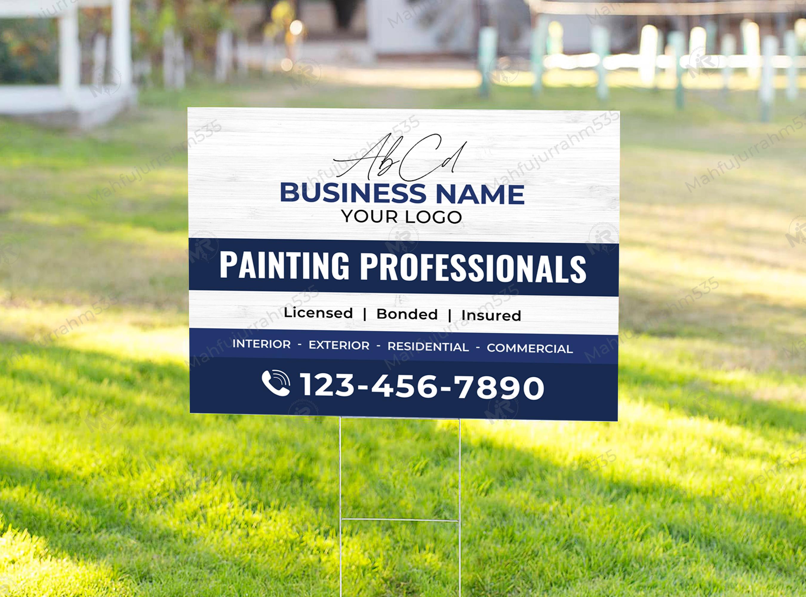 Enhance your local presence and brand authority with this premium Painting Professionals Yard Sign. Designed with a focus on legibility and trust, this layout features a clean navy blue and white aesthetic that makes your business name and contact information pop, even from a distance. By highlighting key credentials such as "Licensed, Bonded, and Insured," this sign immediately reassures potential clients of your professionalism and reliability.