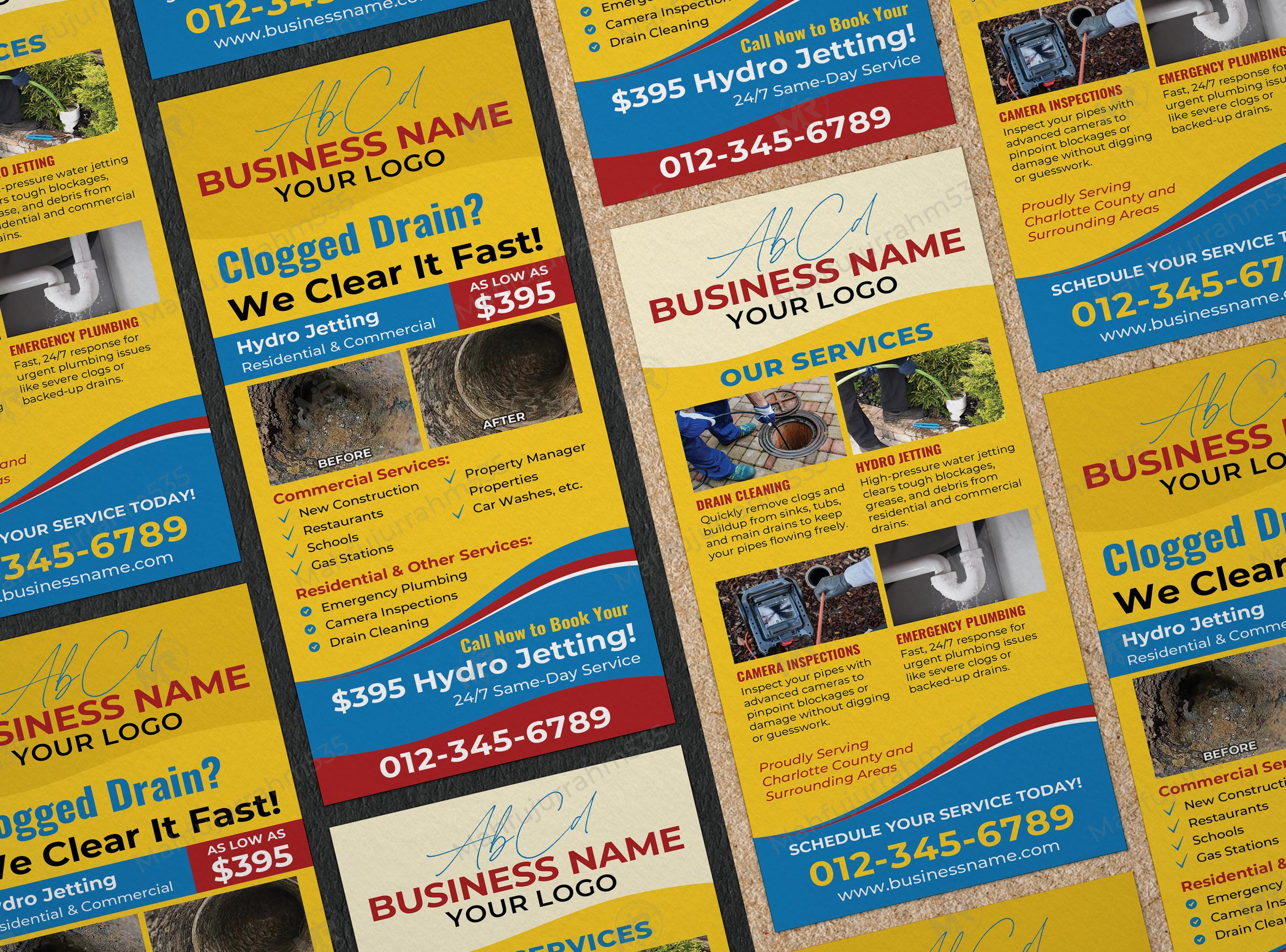 This eye-catching, print-ready plumbing rack card is crafted to convert local leads into booked jobs. Designed for plumbing companies, property managers and service contractors, the layout highlights core services—hydro jetting, drain cleaning, camera inspections and emergency plumbing—using bold headlines, before/after visuals and a clear call to action. The card’s bright, professional color block sections and service icons make contact details and pricing offers instantly readable, helping your target customers act quickly. Text blocks are organized for easy scanning: service list, commercial & residential coverage, quick benefits and a prominent phone number and website area for bookings. The design is fully adaptable for brand colors and logo placement, and comes optimized for print (bleed, CMYK, 300 DPI) so you get crisp, professional results every time.