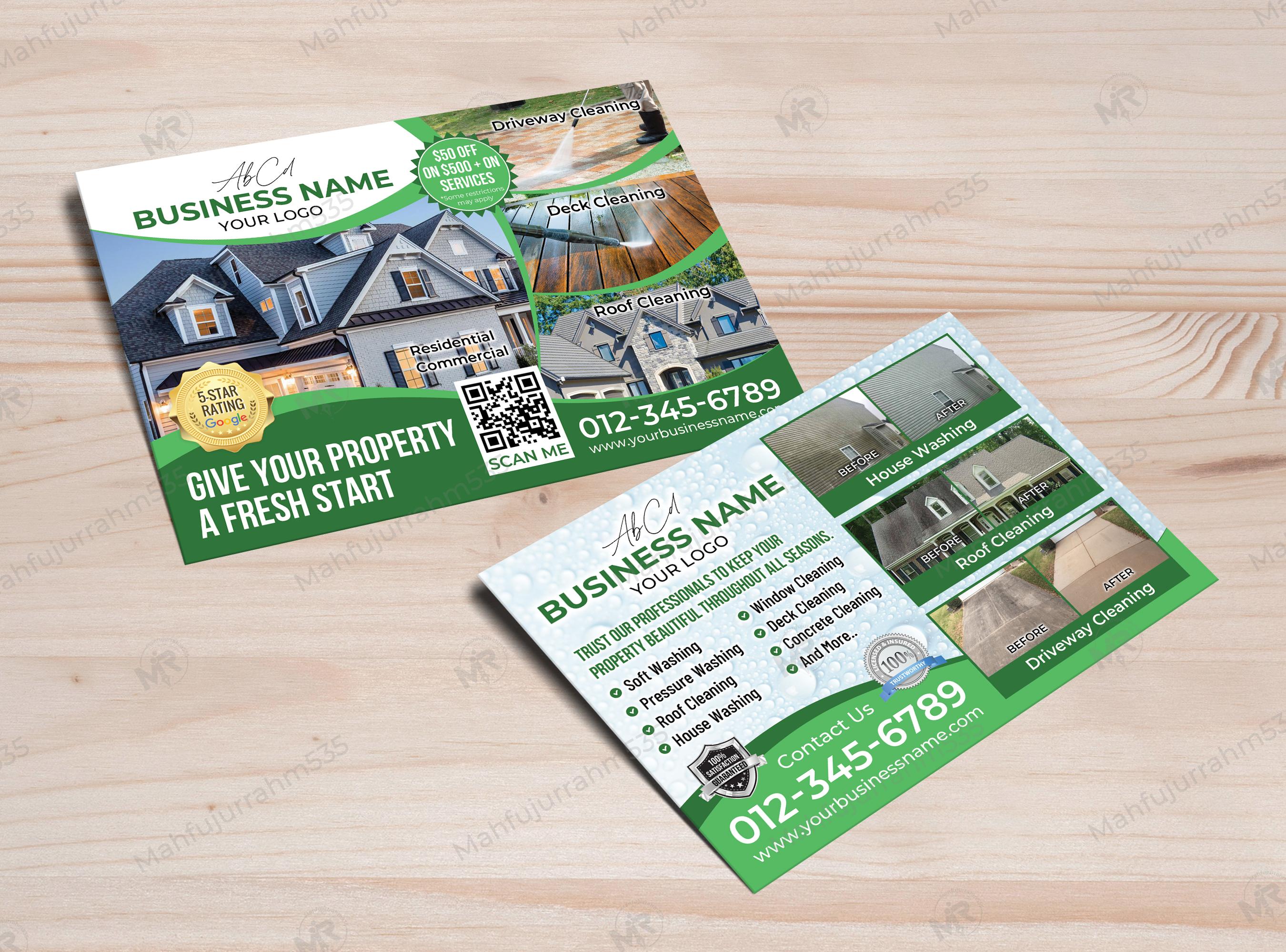 Are you looking for an effective way to promote your cleaning business? This Pressure Washing and Exterior Cleaning Postcard is the perfect marketing tool to showcase your expertise. Designed with a clean, modern aesthetic, it highlights essential services like Roof Cleaning, Driveway Washing, House Washing, and Deck Restoration.