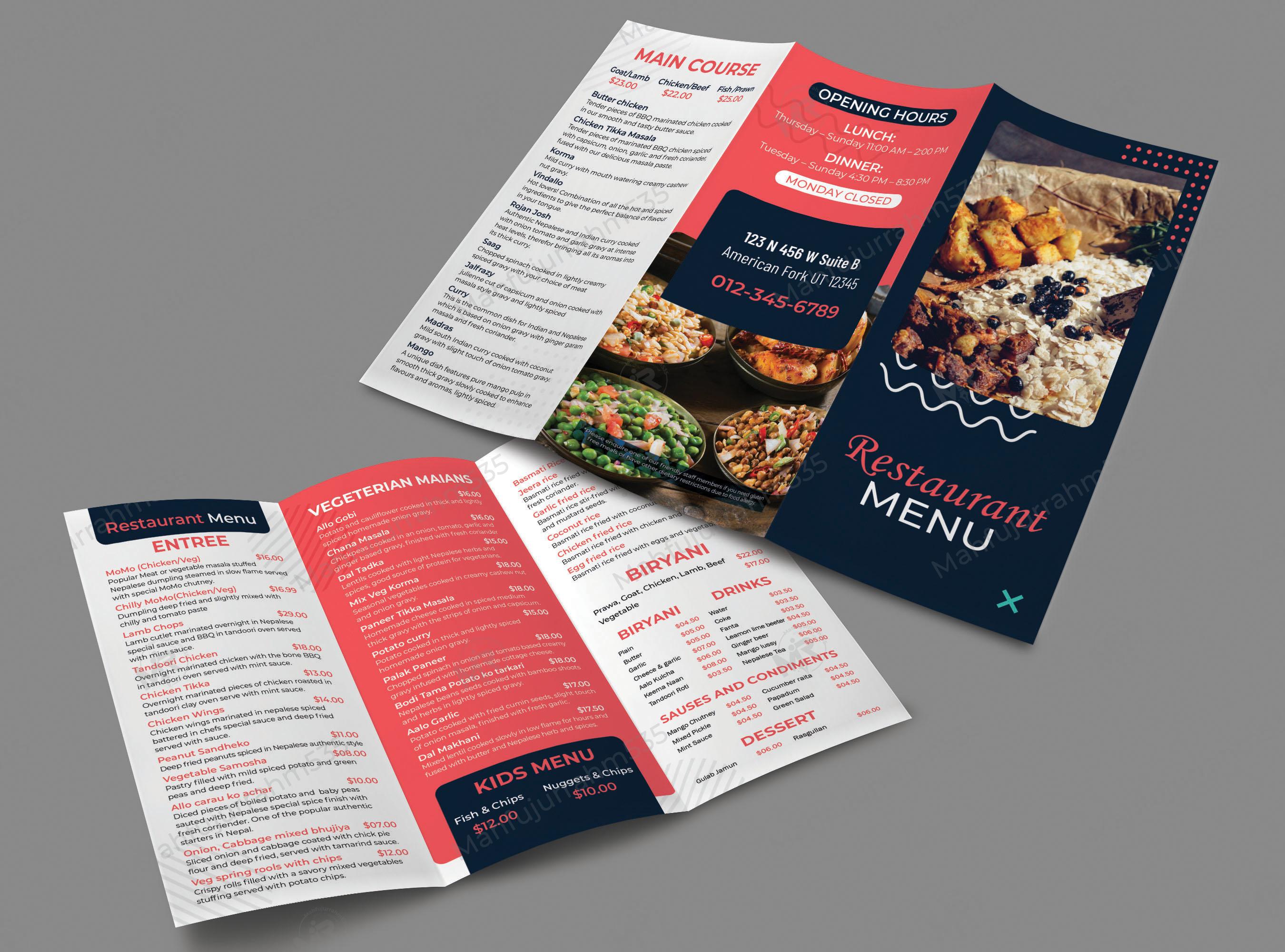 Enhance your customer's dining experience with this highly detailed Tri-Fold Restaurant Menu Design. This extensive brochure template is vital for Indian and South Asian Restaurants that offer a wide and varied selection of dishes, requiring clear categorization to prevent customer confusion. The design is strategically structured using verified restaurant industry information, ensuring all main categories—Entree, Main Course, Vegetarian Mains, Biryani, and Sides—are clearly separated and legible. This makes it the perfect, ready-to-use asset for any Restaurant company specializing in this cuisine, requiring minimal customization to implement immediately.