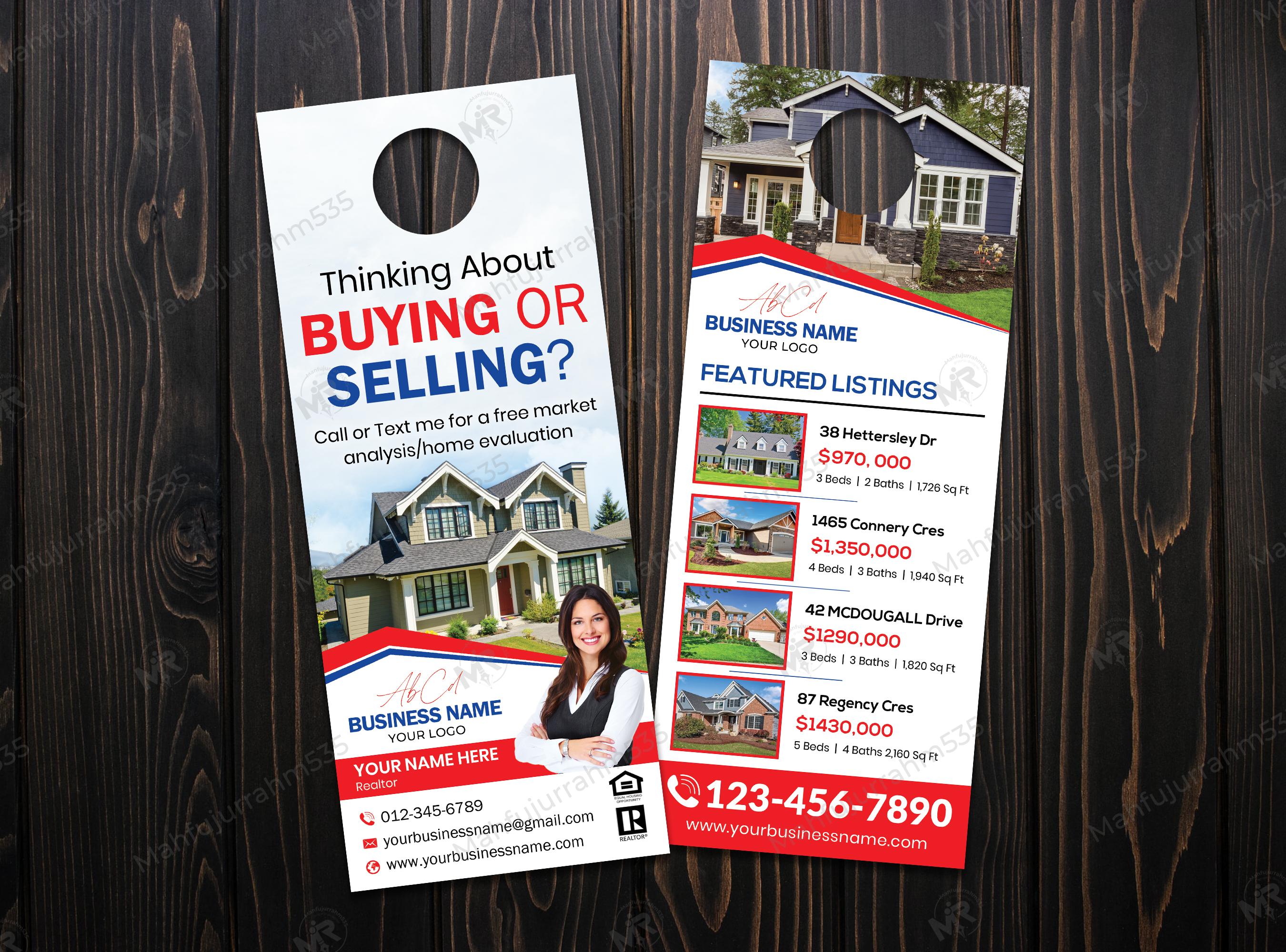This professionally styled Real Estate Door Hanger design is crafted to attract serious buyers and generate leads for agents and brokerages. Featuring bold “Buying or Selling?” messaging, large hero property imagery, and a clear agent block for photo, contact, and branding, the layout balances attention-grabbing typography with well-organized listing details so recipients can instantly see featured homes, prices, and contact information. The double-sided layout includes a prominent call-to-action on the front and a vertical featured-listings panel on the reverse — perfect for open house promotion, neighborhood farming, and targeted door-to-door marketing.