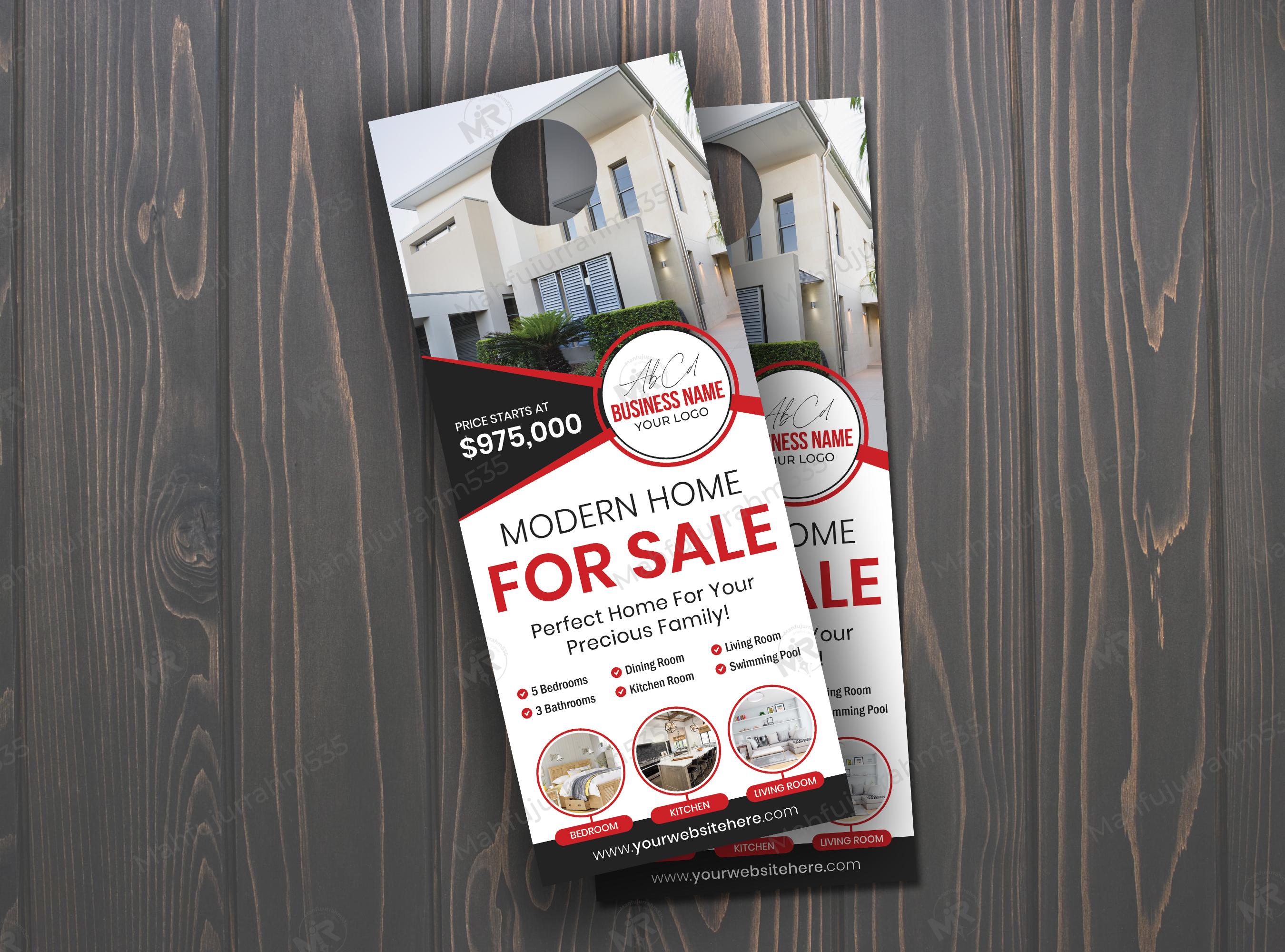 Directly market your high-value properties with this striking Real Estate Door Hanger Design. This two-sided template is an excellent tool for Realtors and Brokers specializing in upscale residential listings. The design is meticulously structured using verified real estate industry information, focusing heavily on visual appeal and key property details to attract qualified buyers. It's the perfect, ready-to-use asset for any real estate professional, ensuring minimal customization is required for immediate use.