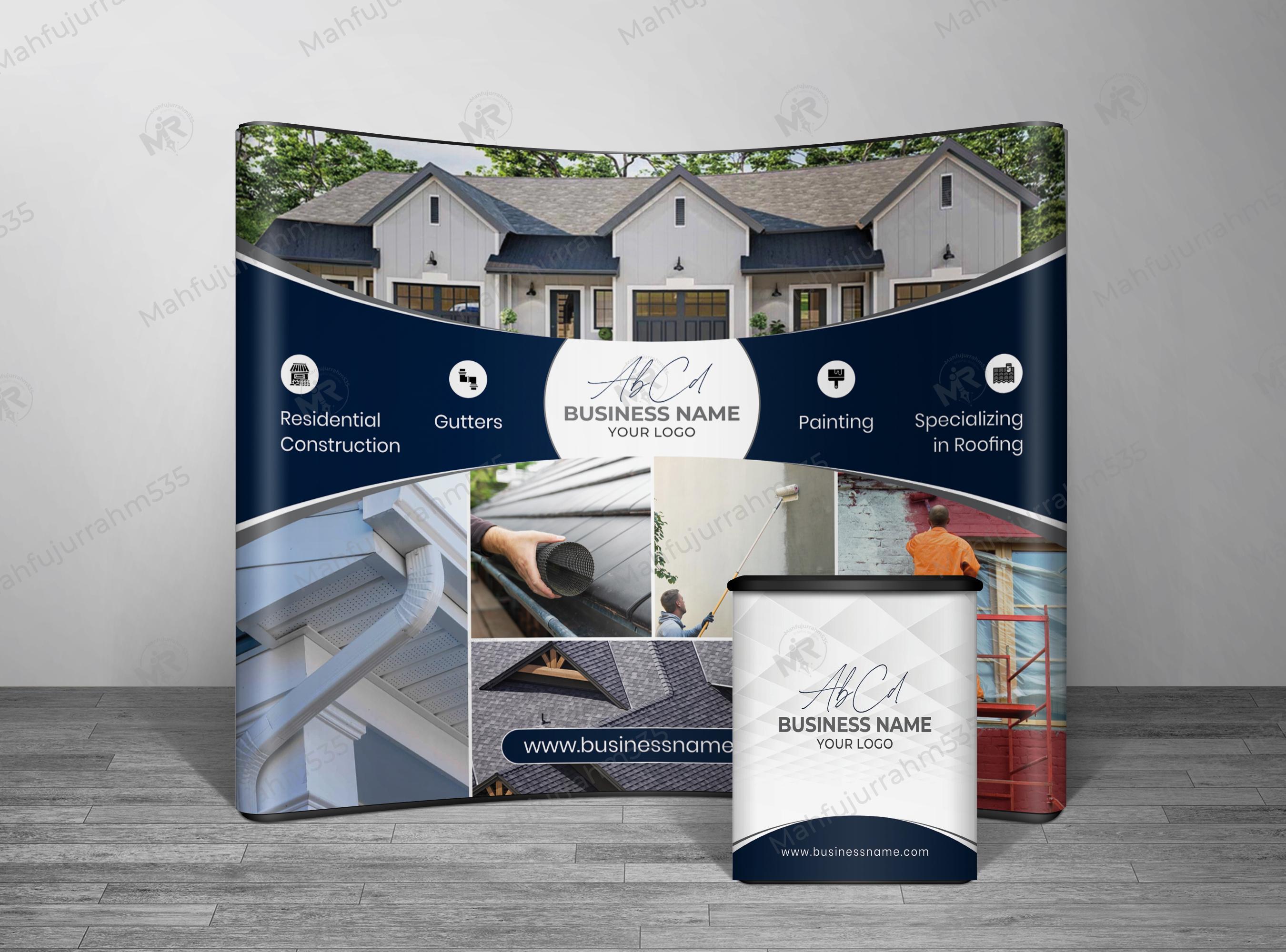Supporting images beneath each category provide visual proof of work, showcasing specific services like gutter installation, roofing details, and painting work. The accompanying podium banner prominently features the Business Name and logo, ensuring strong brand visibility. This print-ready trade show display is designed to draw attention, clearly inform visitors of your capabilities, and drive high-quality engagement at events.