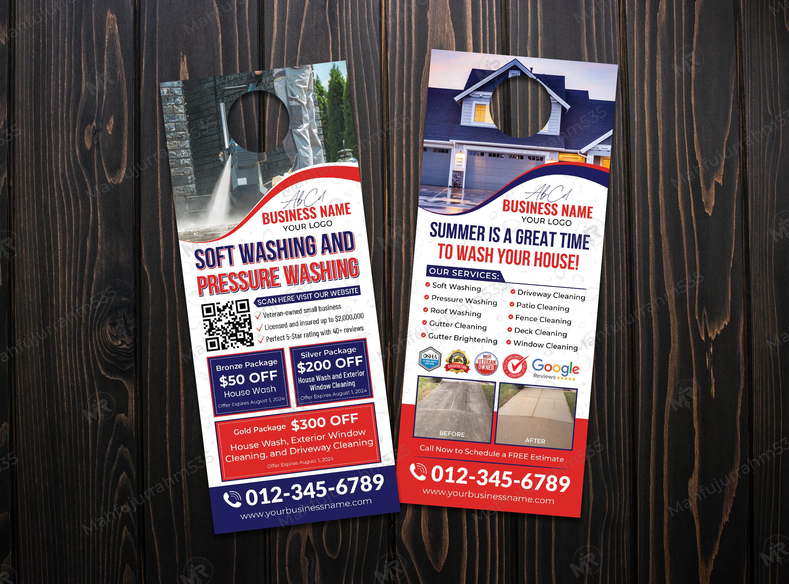 Are you looking for an effective way to dominate your local market? Our Pressure Washing Door Hanger Design is specifically engineered for exterior cleaning professionals who want to make a lasting impression at every doorstep. This double-sided template combines aesthetic appeal with a high-conversion layout, perfect for promoting soft washing, roof cleaning, and driveway maintenance services.