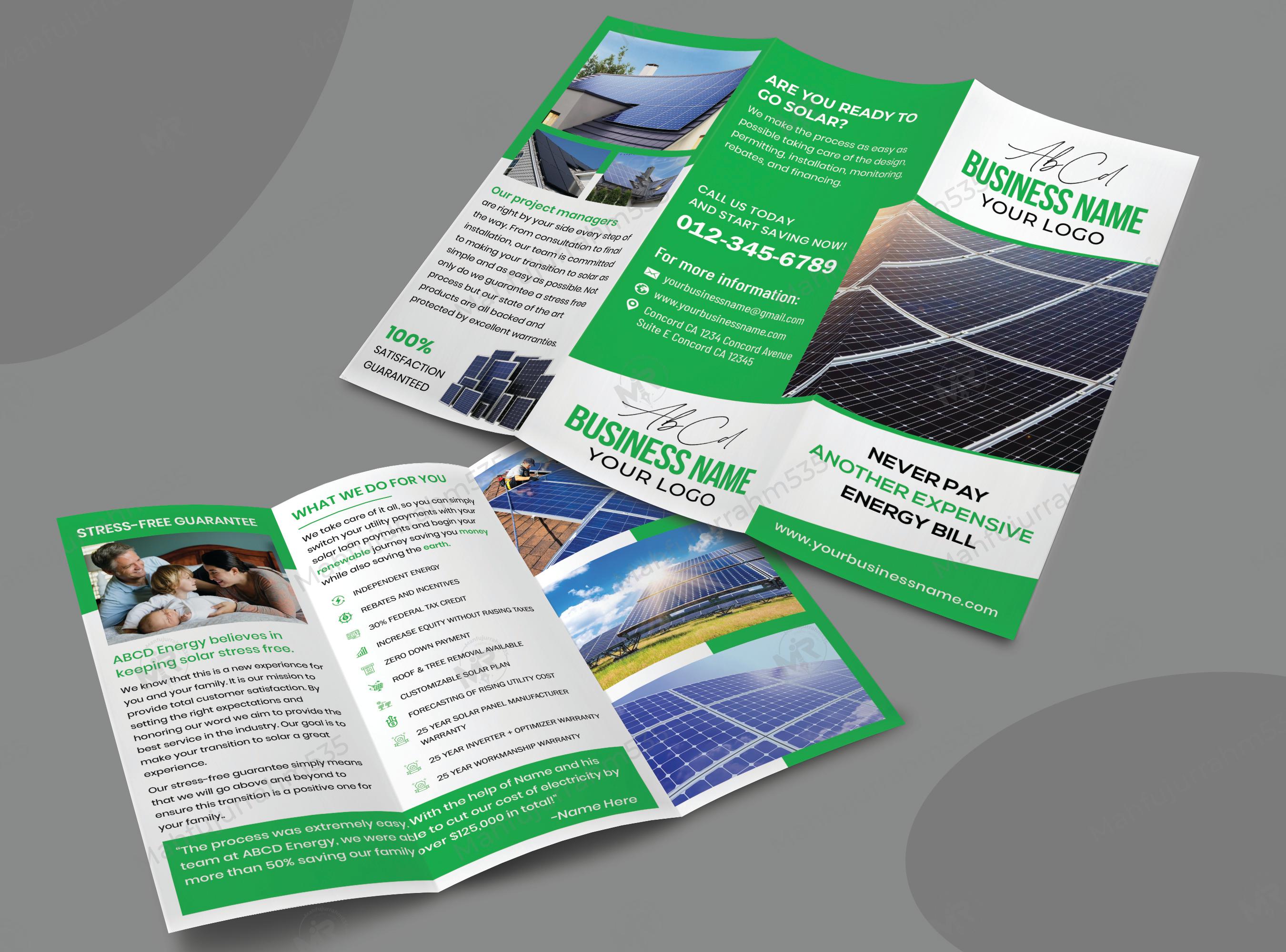 Present your brand with authority using our premium Solar Energy Company Brochure Design. This tri-fold template is engineered to walk potential customers through their transition to clean energy—from initial consultation to final installation. It features a clean, professional layout that highlights a "Stress-Free Guarantee" and a detailed list of benefits, including independent energy production, federal tax credits, and increased property equity.