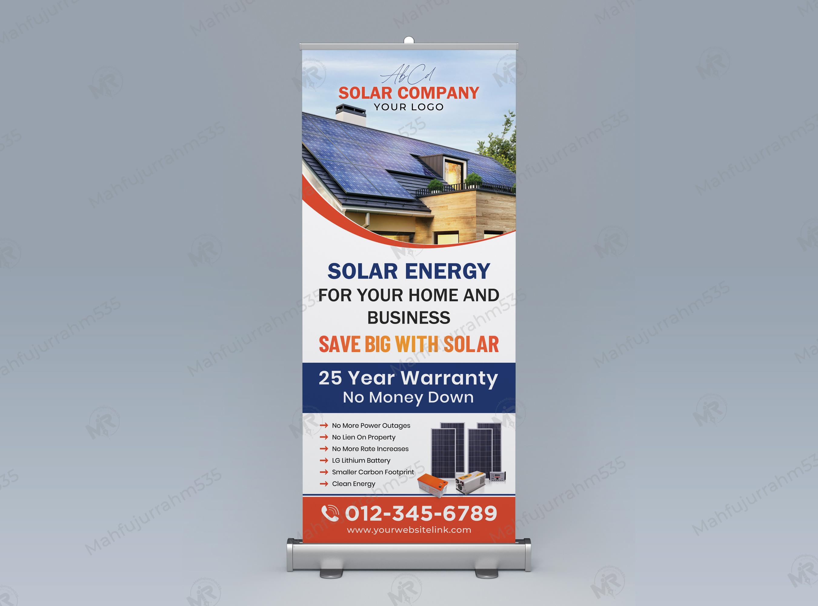 This design is strategically optimized with industry-leading incentives that resonate with both residential and commercial clients. It prominently displays a 25-Year Warranty and a No Money Down financing model to eliminate consumer hesitation. The banner also includes an easy-to-read checklist of essential solar advantages, such as energy independence, protection against rate increases, and the use of clean energy. With its professional layout, clean typography, and clear space for your logo and contact details, this template ensures your brand stands out as a leader in the renewable energy sector.