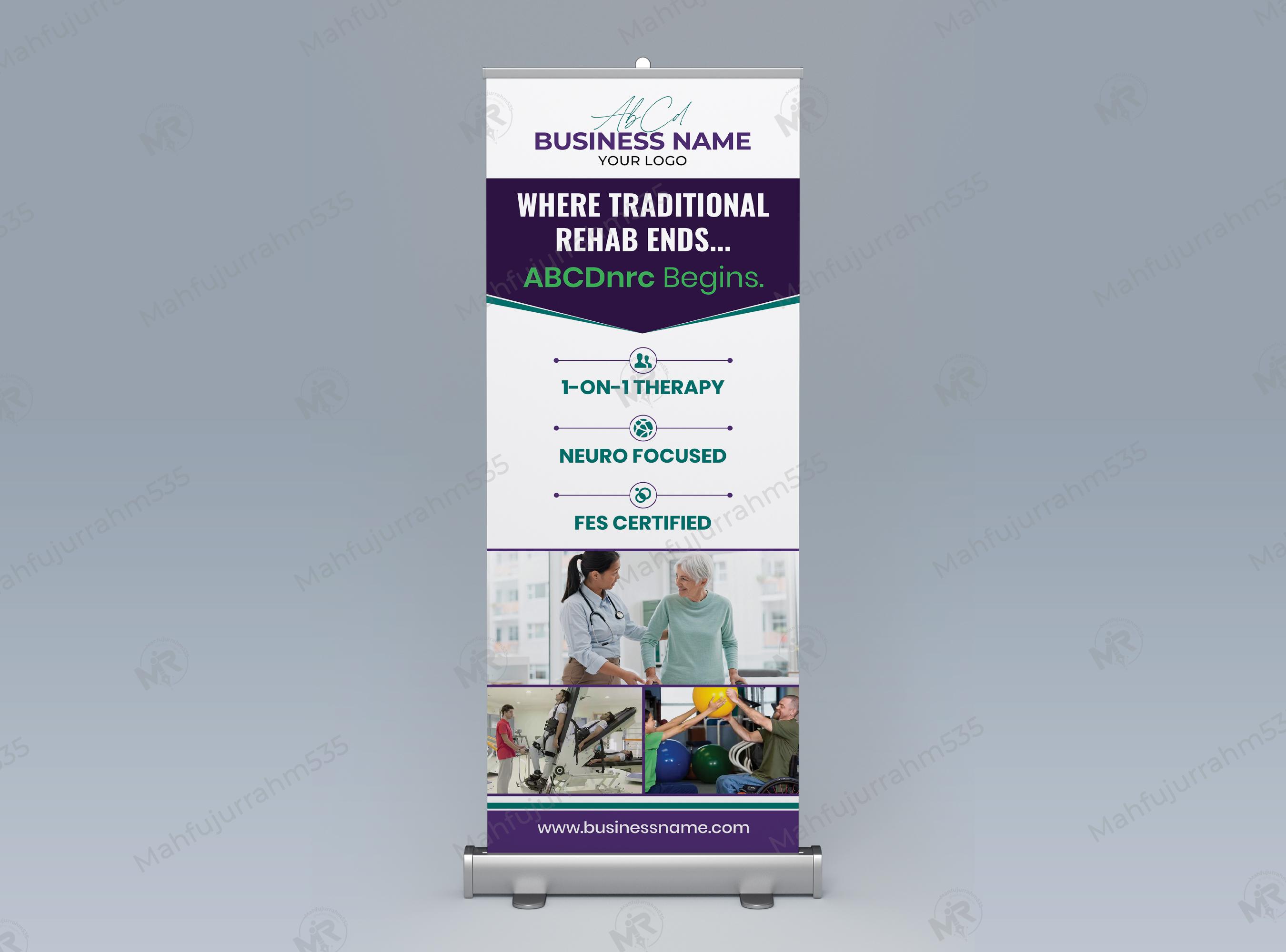 This highly specialized and professional Rollup Banner template is expertly designed for a Neurological Rehabilitation Center that offers advanced, cutting-edge support. The design uses a powerful, compelling headline—"WHERE TRADITIONAL REHAB ENDS... ABCDnrc Begins."—to establish the center as a leading, non-conventional solution for complex neurological conditions.