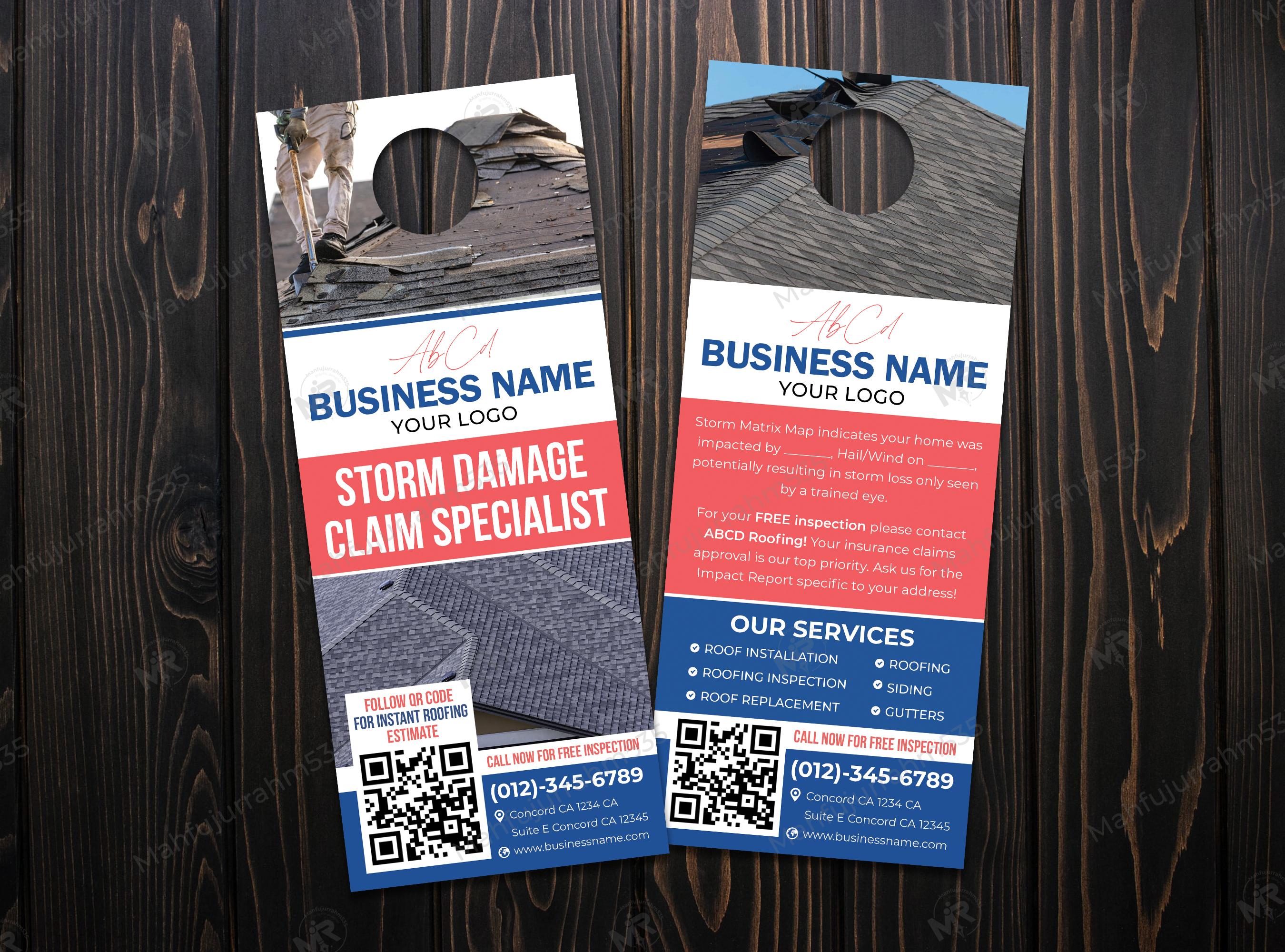 When disaster strikes, homeowners look for reliable experts to handle their repairs and insurance claims. This Storm Damage Claim Specialist Door Hanger Design is specifically engineered to establish immediate trust and authority. Using a bold red, blue, and white color scheme, it captures attention from a distance while maintaining a clean, professional aesthetic.