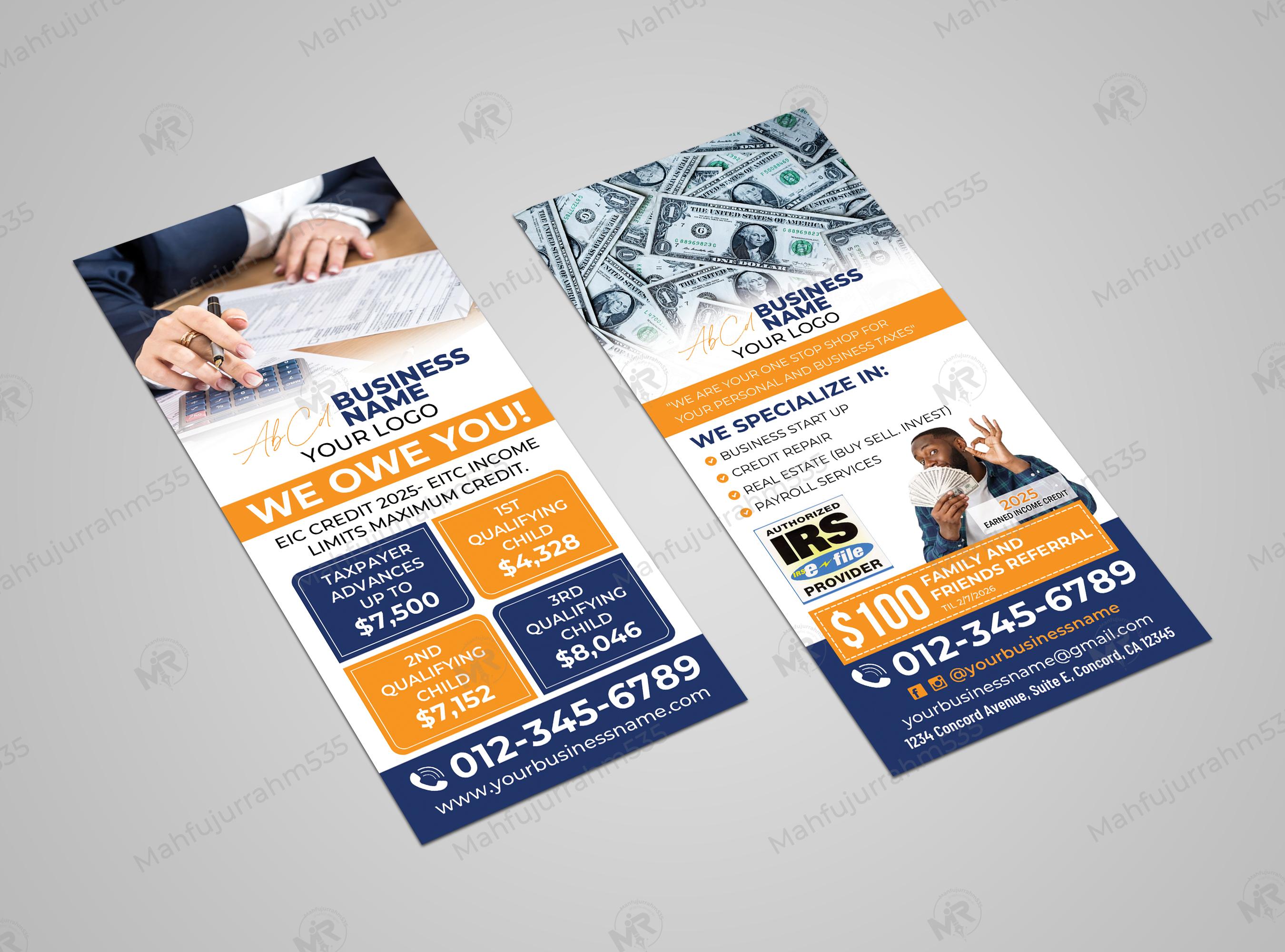 What sets this design apart is its industry-specific accuracy. We have incorporated researched 2025 EITC income limits and maximum credits, including specific figures such as $4,328 for 1 qualifying child, $7,152 for 2 children, and $8,046 for 3 or more children. The reverse side positions your agency as a "One Stop Shop" for personal and business taxes, listing specialized services like Business Start-up assistance, Credit Repair, Real Estate consulting, and Payroll Services. It also includes a dedicated space for a $100 Family and Friends Referral program to boost your word-of-mouth marketing.