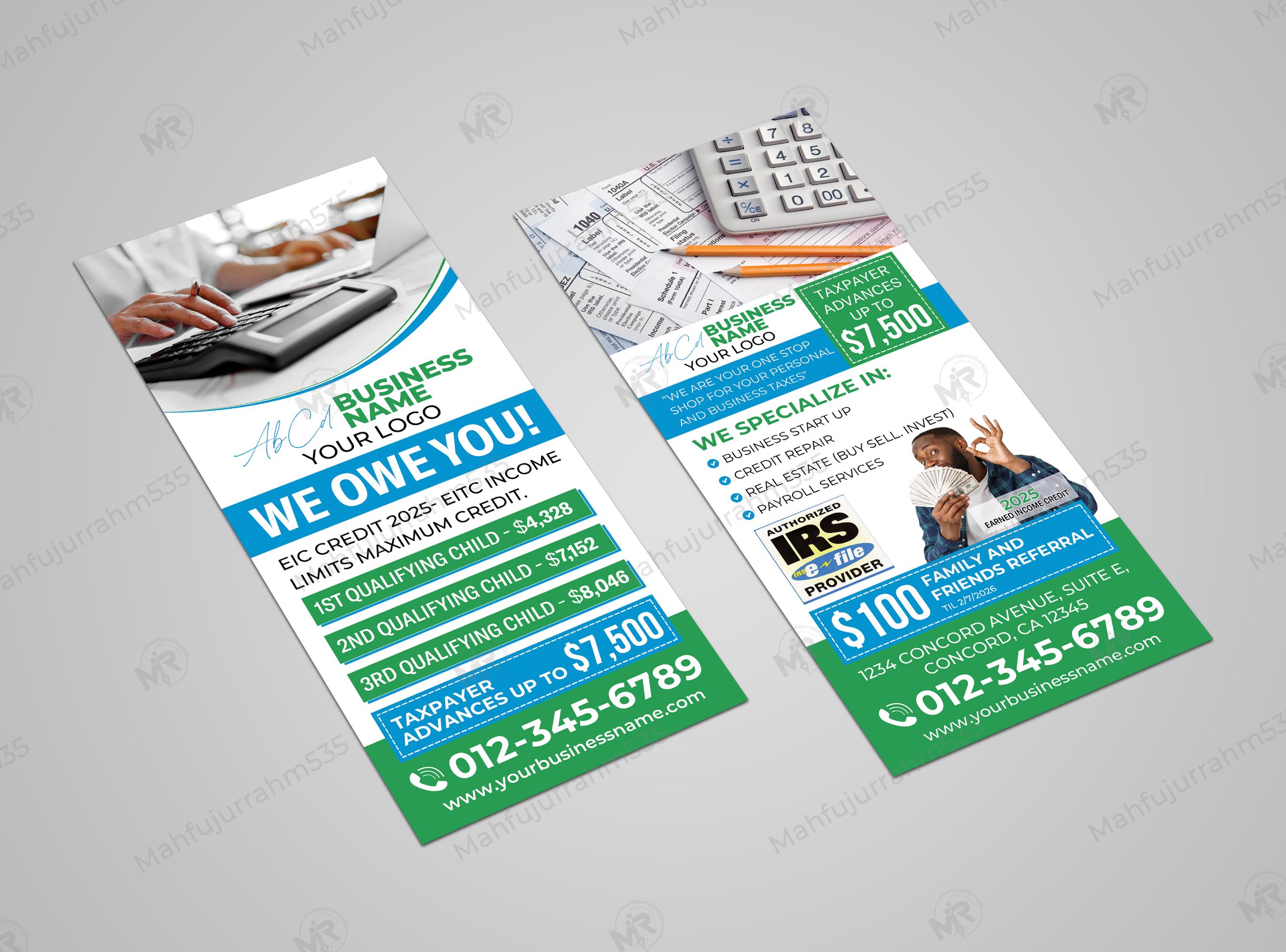 Maximize your firm's visibility this upcoming season with our premium Tax Services Rack Card Design. This professional, double-sided template is meticulously engineered for Authorized IRS e-file Providers who want to position themselves as a "One Stop Shop" for both personal and business taxes. The layout is strategically organized to capture attention with a bold "WE OWE YOU!" headline and highlights high-value incentives like Taxpayer Advances up to $7,500.