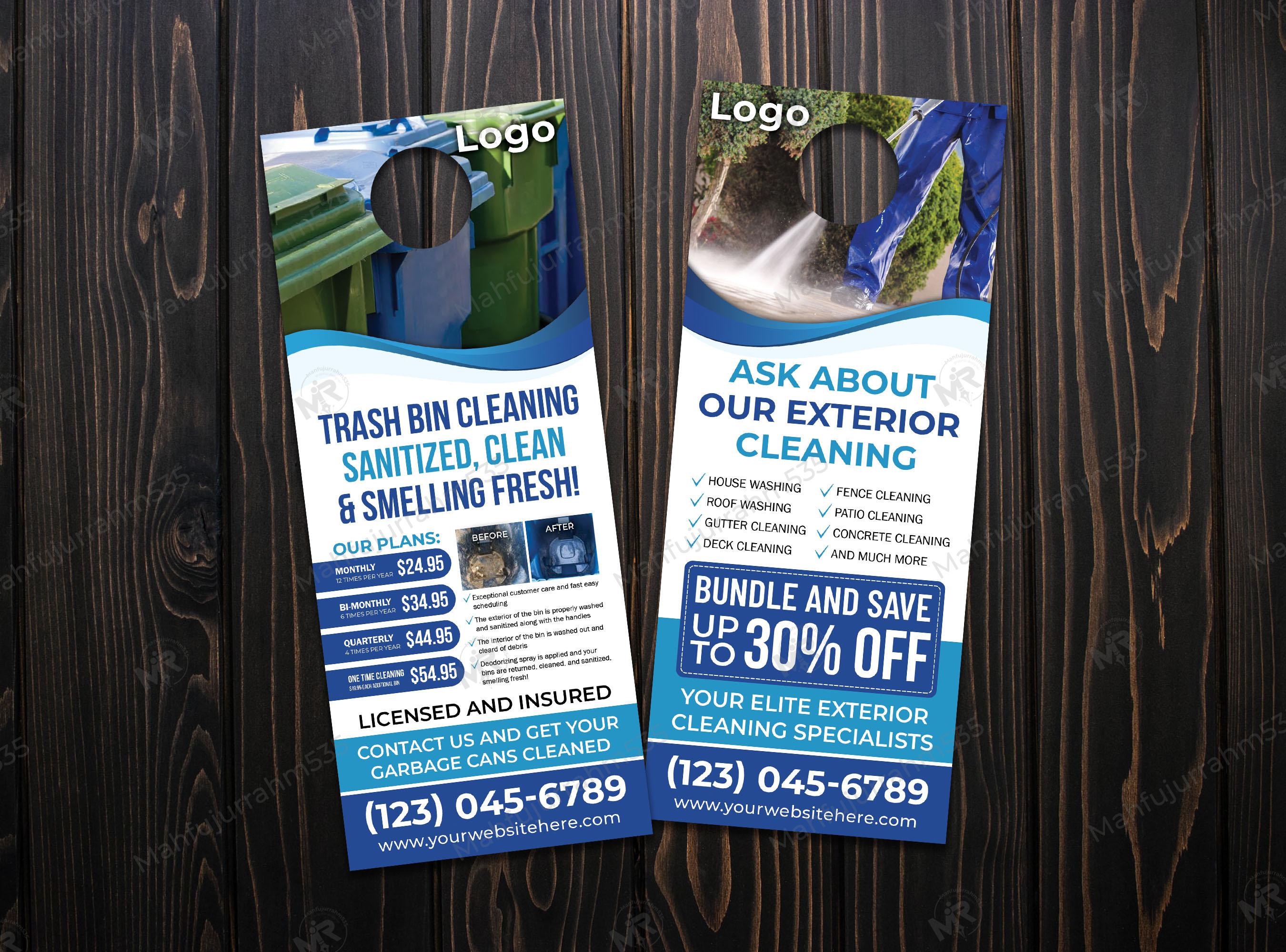 Boost your local marketing efforts with our premium Trash Bin Cleaning and Exterior Cleaning Door Hanger. This template is specifically designed for cleaning professionals who want to offer a specialized service that homeowners truly need. The front side features a bold, attention-grabbing headline: "Trash Bin Cleaning - Sanitized, Clean & Smelling Fresh!", accompanied by high-quality "Before & After" visuals that demonstrate the effectiveness of your sanitation process.